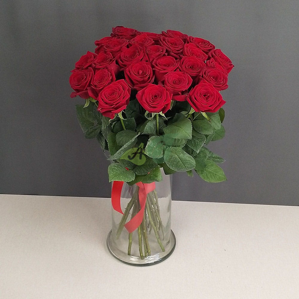 • Роза - 25 штук, цвет - красный, длина стебля - 60 см;